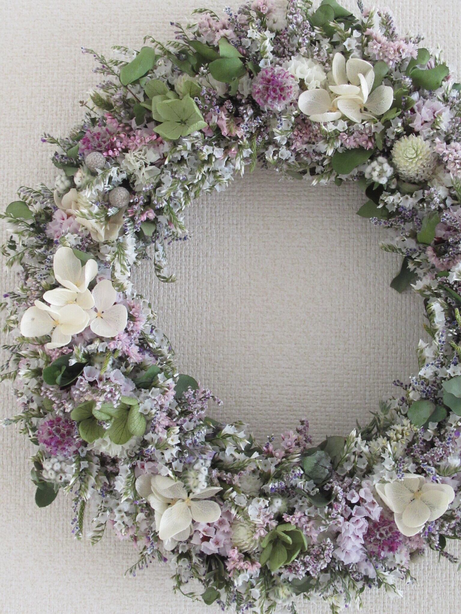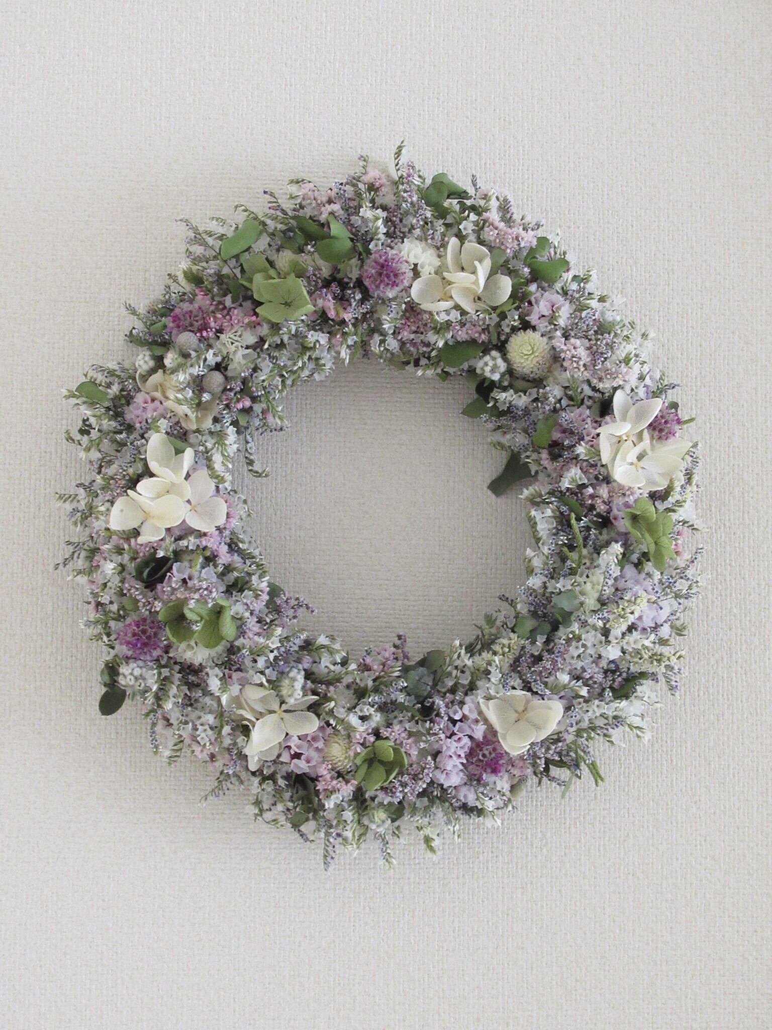 リモニューム4種類、ユーカリ、千日紅、スターチス2種類のドライフラワーに紫陽花のプリザーブドフラワーをアクセントに散りばめたリースです。