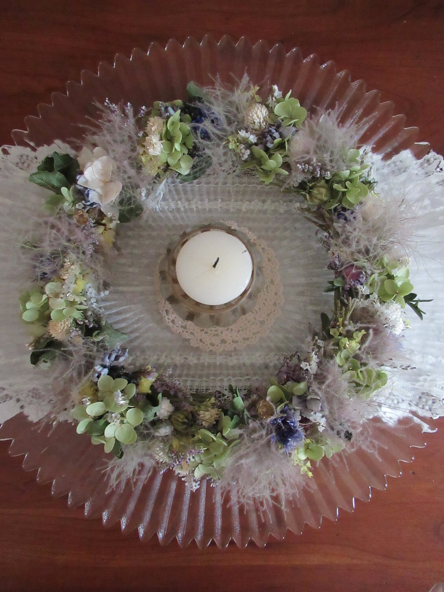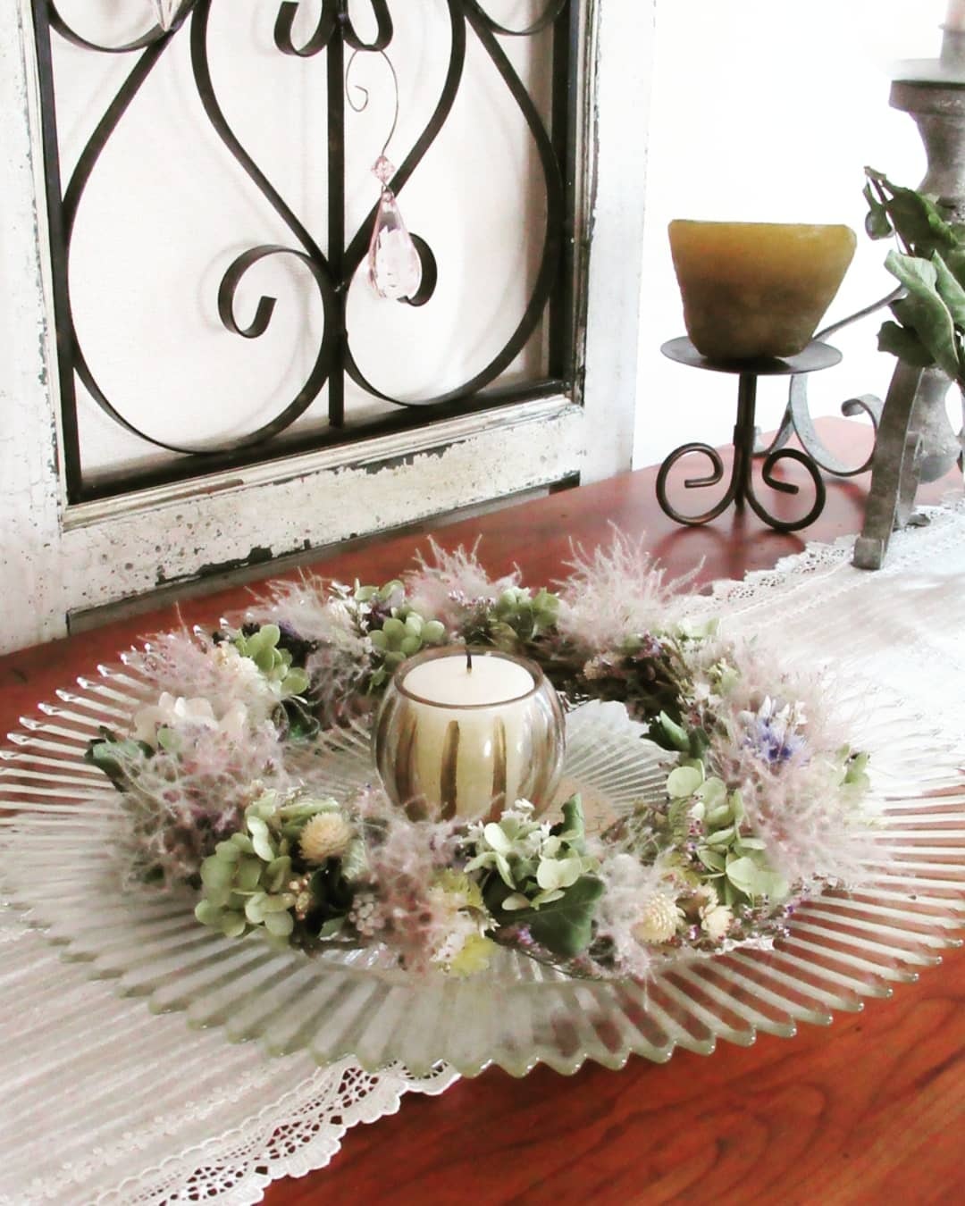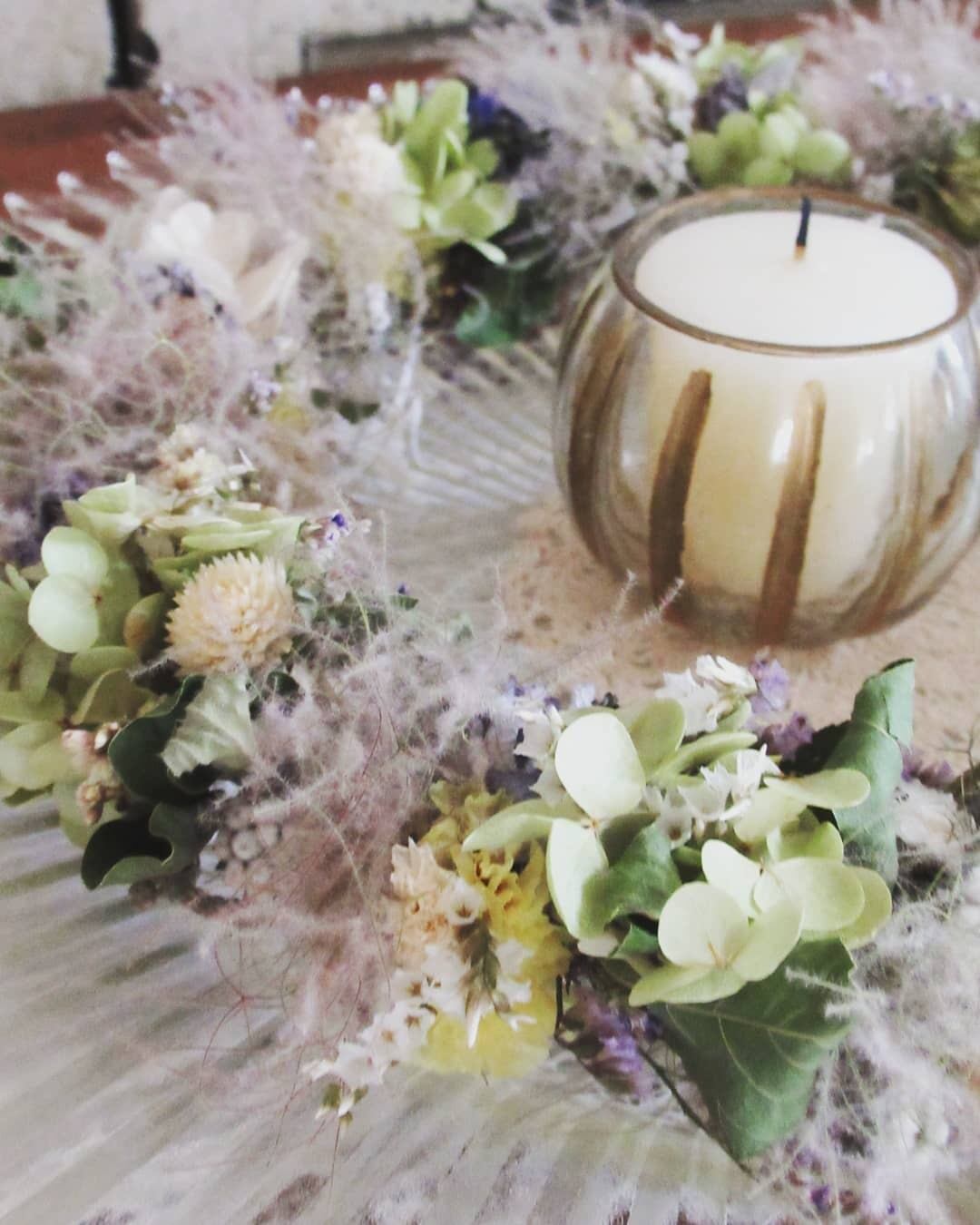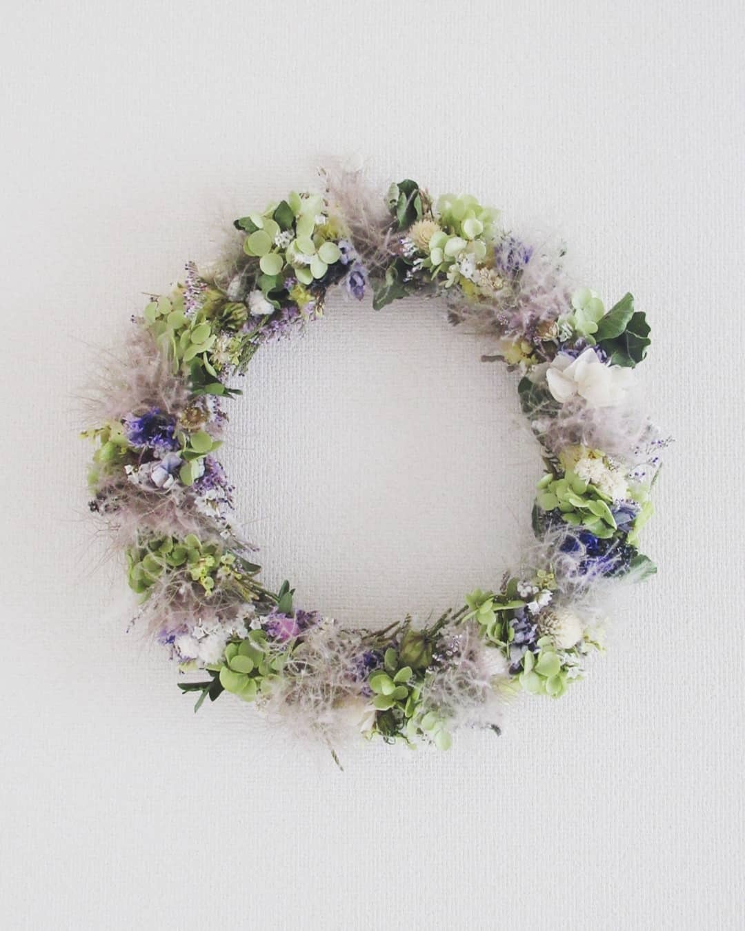 アナベルとスモークツリーをメインに細身の繊細なリースに仕上げました。萼紫陽花やリモニュームの他にもたくさんの草花が入っておりますので、みるたびに新たな発見をお楽しみ頂けると思います。実物は写真よりくすんだ色合いに感じるかもしれません。繊細なため、葉や花が落ちやすいです。ご理解のある方にお求め頂きたいと希望します。徐々にドライが進み、アンティークなリースに変わりゆく過程をお楽しみください。