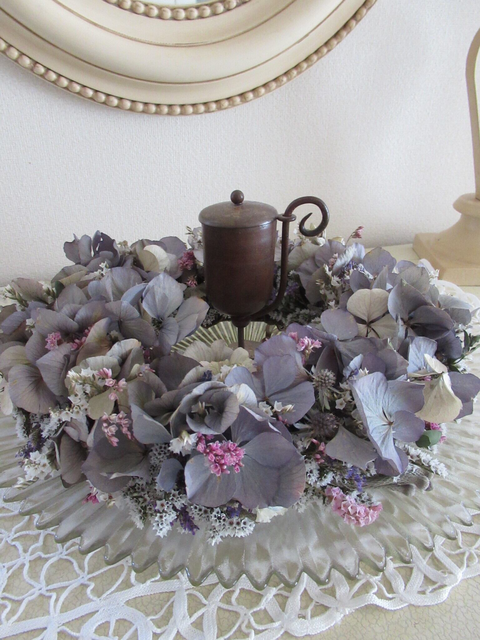 ドライフラワー紫陽花をたくさん使ったリースです。紫陽花も小花も全て自然乾燥のため、アンティークな色合いに変わる過程もいっしょなはず。時間の流れをお楽しみください。ドライフラワーの繊細さをご理解頂けます方へ。