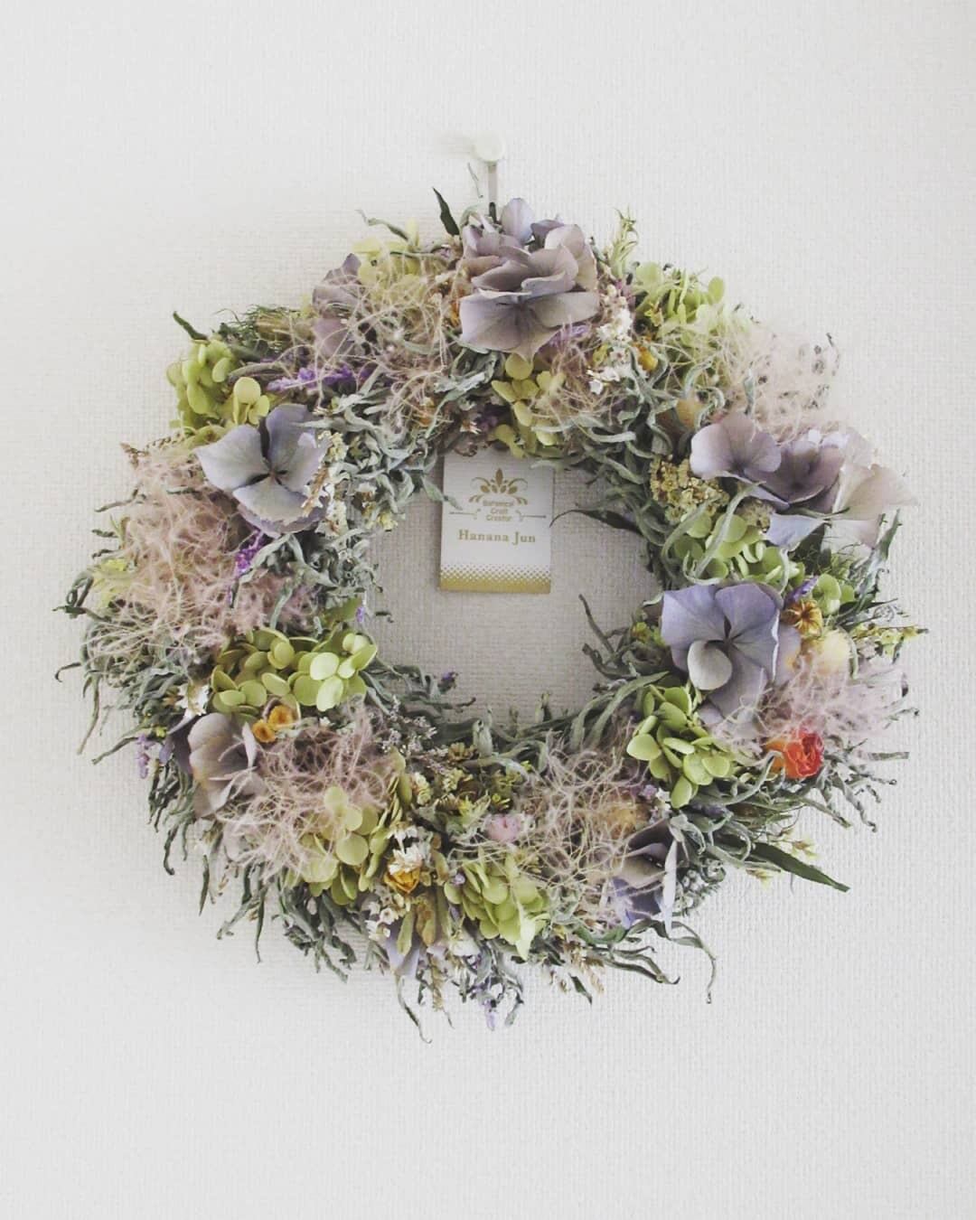 もしゃもしゃなドライフラワーリースです。実物は写真よりくすんだ色合いになります。アメジストセージに紫陽花スモークツリー、リモニューム、千日紅などなど草花の中に、薔薇も入っていますから、もしゃもしゃだけではなく盛り盛り盛りだくさんです。