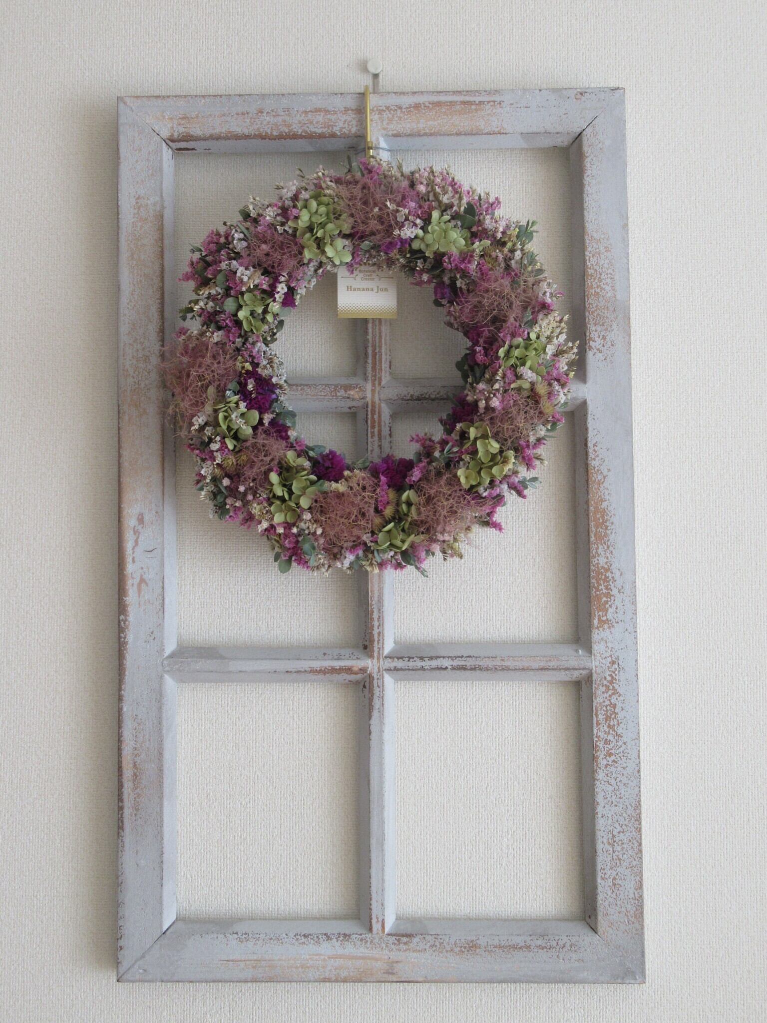 秋桜畑で風にそよぐコスモスたち。リースにしてみましたら、こんなイメージでした。リモニューム・スターチス6種で花々の色合いを。アナベルやユーカリ他の草木で茎や葉をイメージしました。