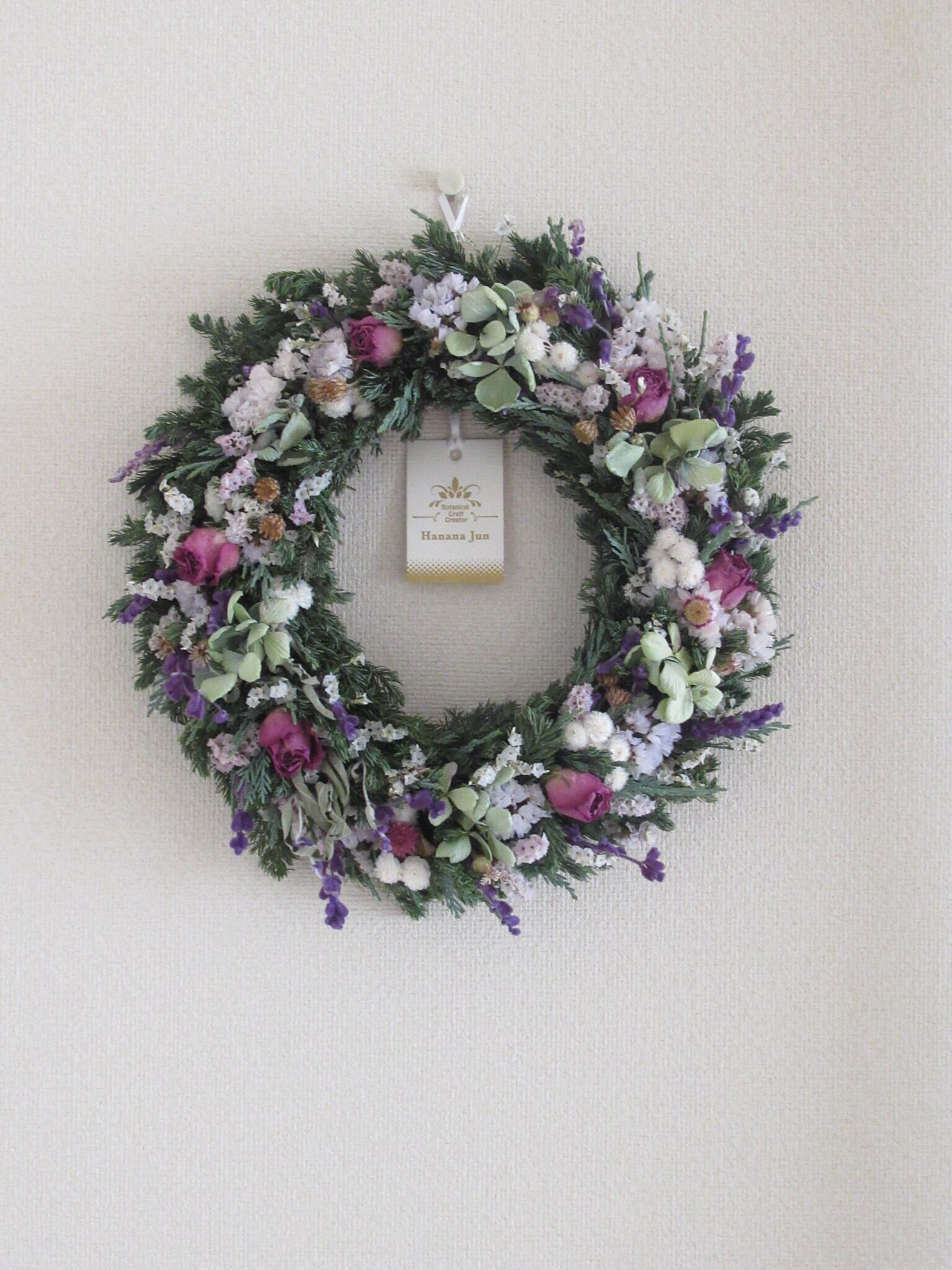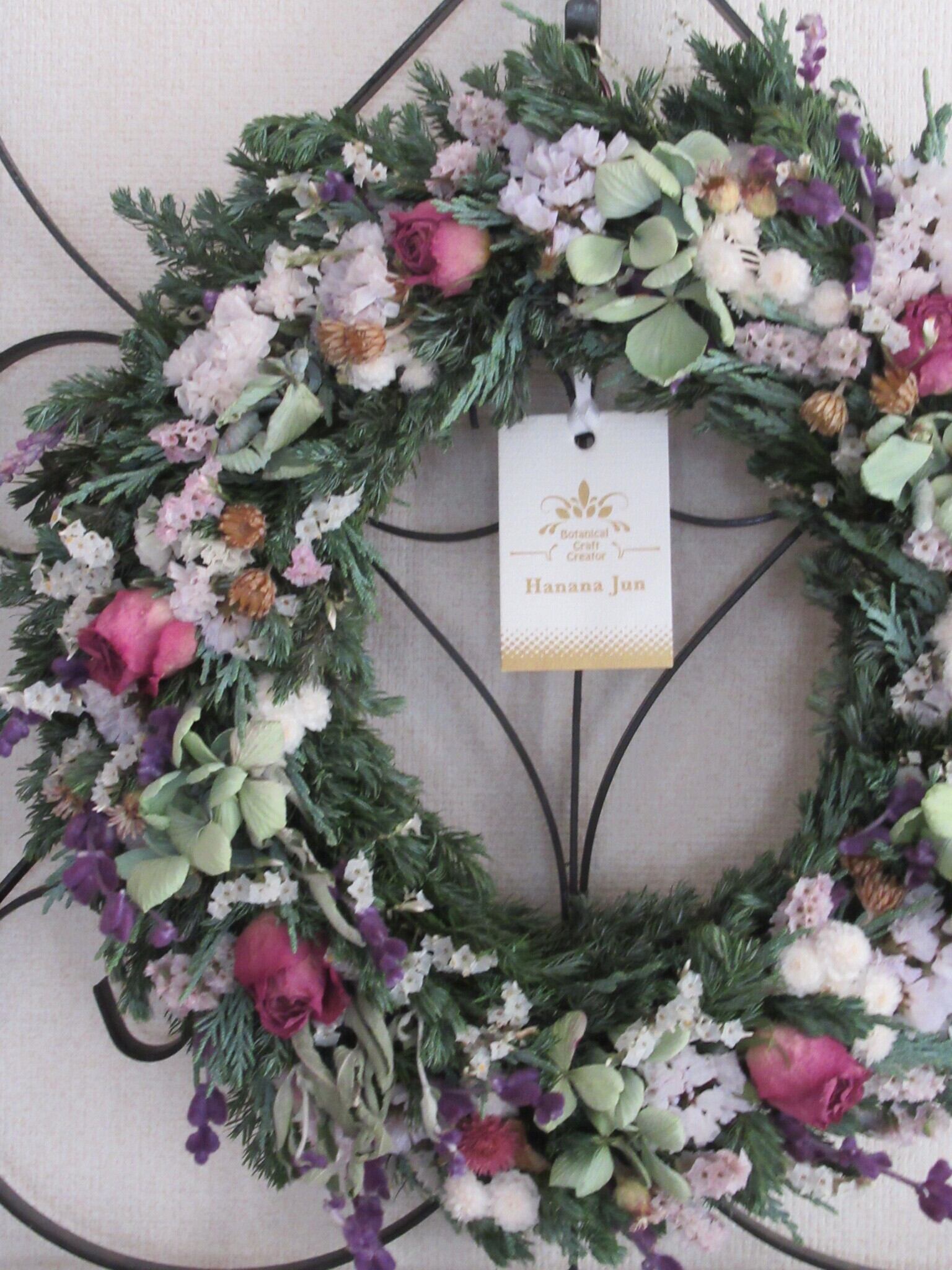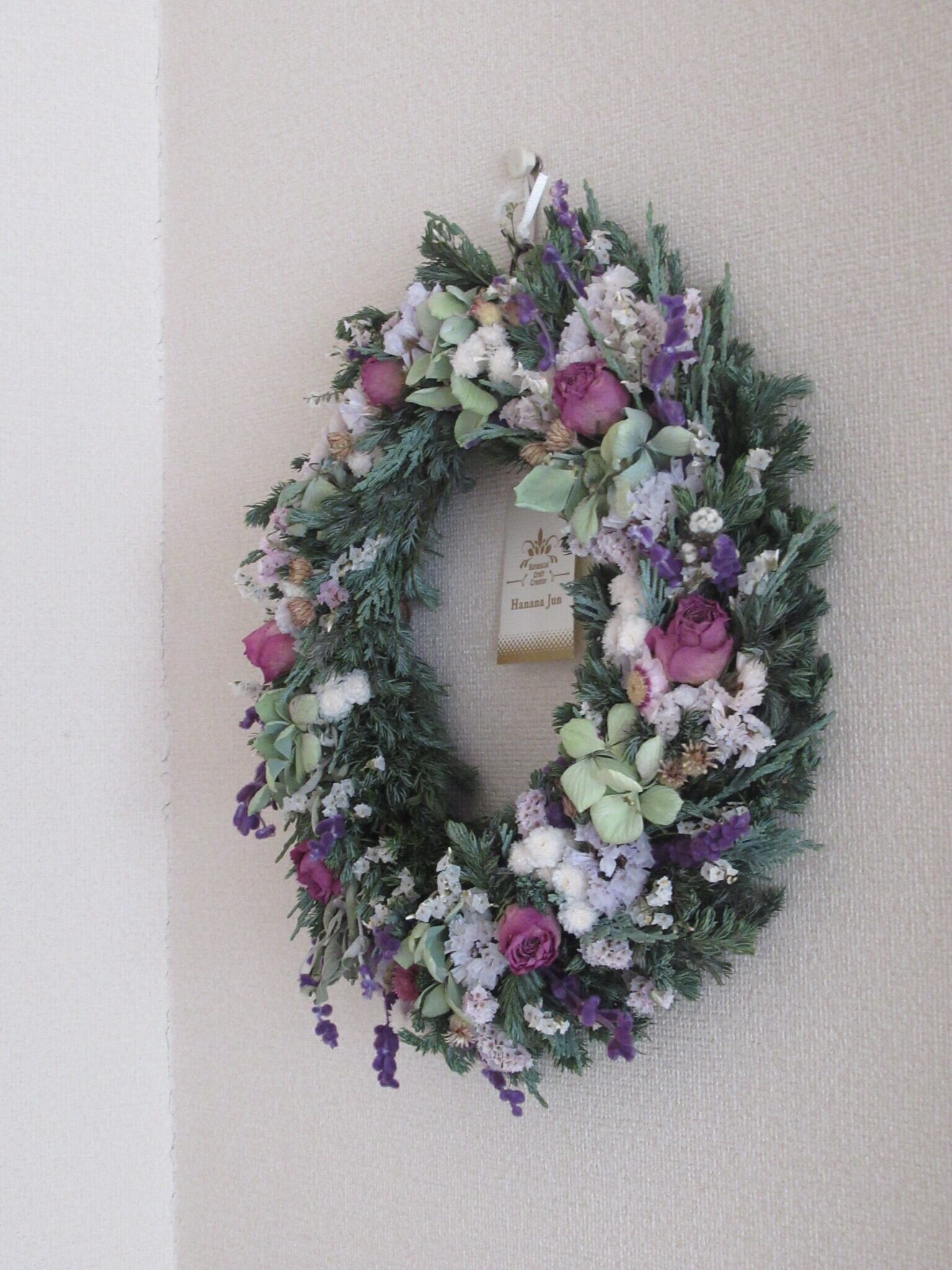 コニファー、アジサイ、バラ、スターチス、リモニュームなどのドライフラワーをまとめました。ボリュームを抑えて薄めに作りましたので、絵画のように飾って頂けます。