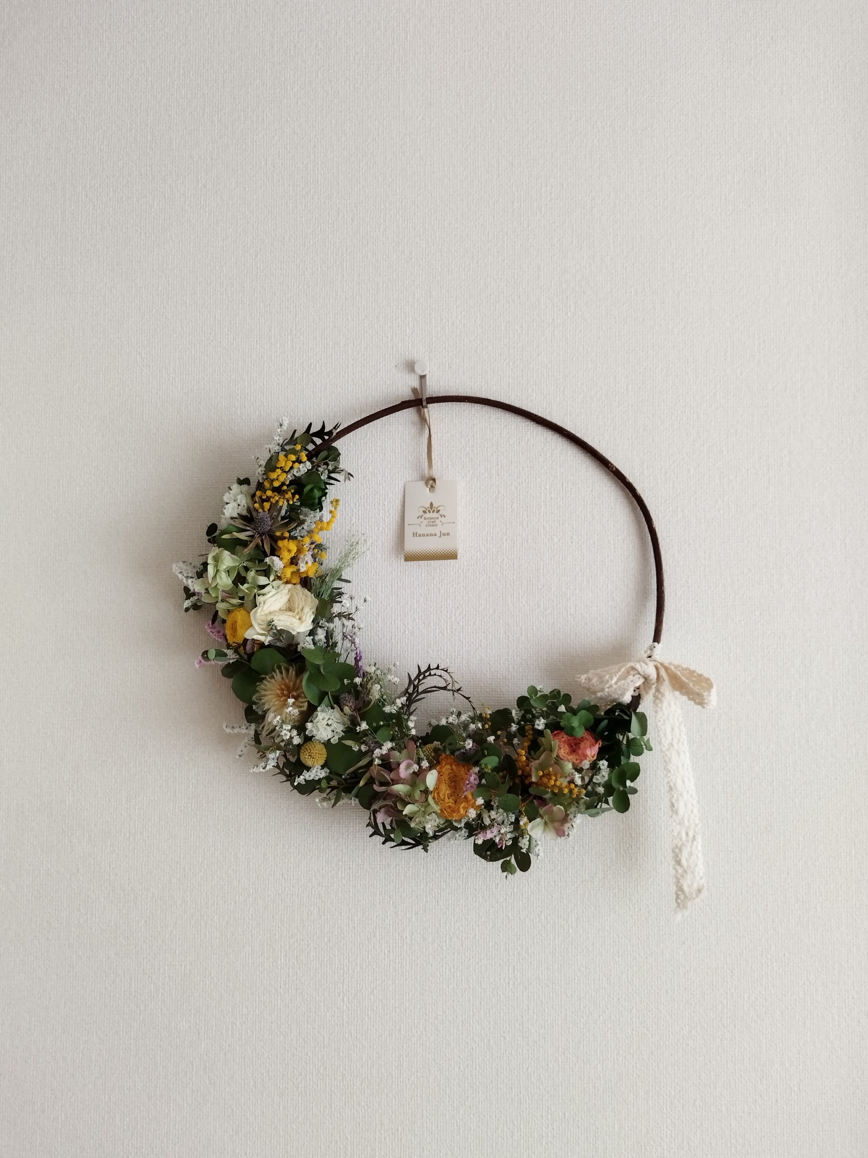 花籠みたいなリースが出来上がりました。バラ、ラナンキュラス、カスミソウ、リモニューム、スターチス、アジサイ、ミモザに、ドライフラワーならてはの、クラスペディア、リューカデンドロン、スモークグラスなどをユーカリやグレビレアアイバンホーとまとめました。