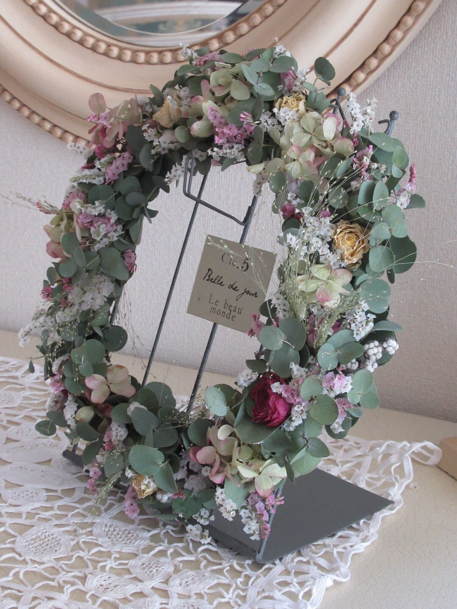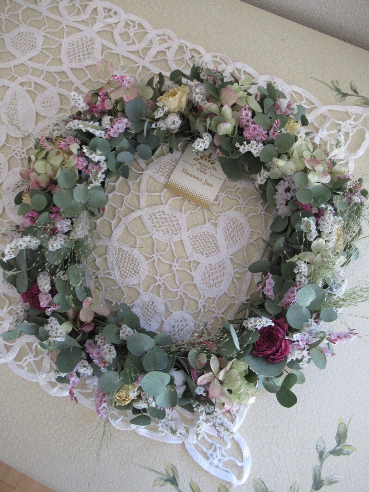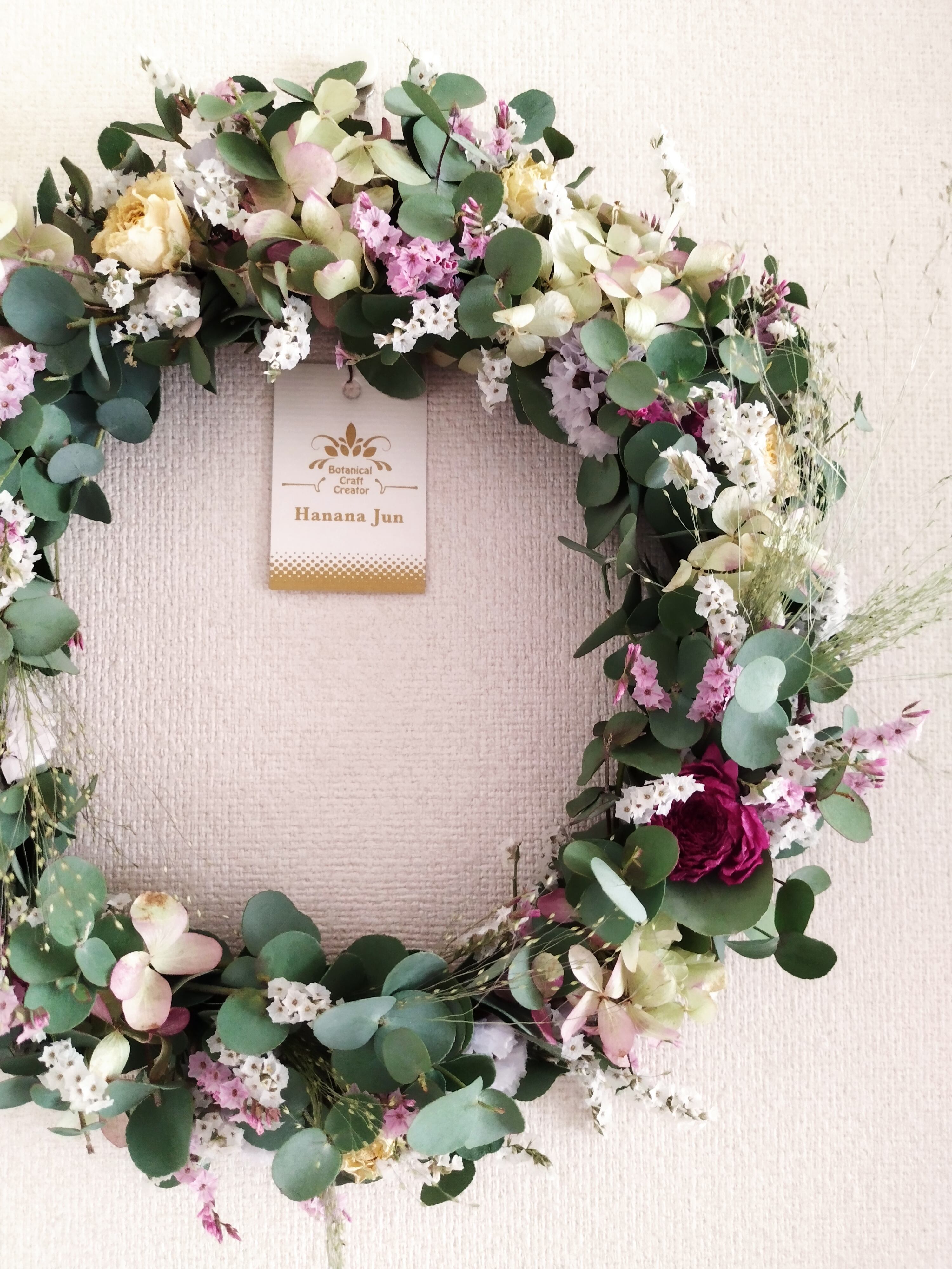 ユーカリベースに、小薔薇、ラナンキュラス、リモニューム、スターチス、アジサイ、等の小花を散らし、スモークグラスでアクセントを入れました。 春の野原をお部屋に取り入れたようなドライフラワーリースです。