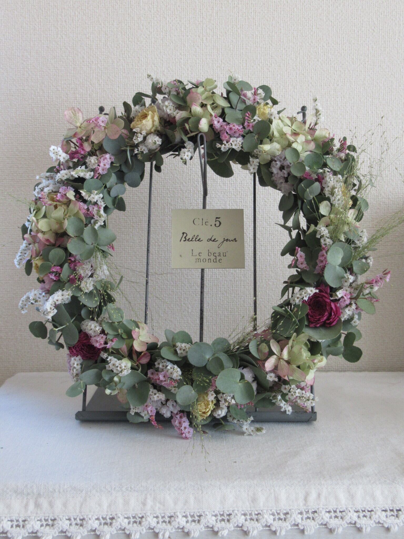 細いアイアンを芯にして作りましたので、形も曲げて変えられます。反面、形が崩れやすいとも言えますので、今回はアイアンのリース飾りをセットにいたしました。そのままどこにでも置けますから、場所を選びません。リースのみ(3900円)ご希望の方はお問い合わせください。