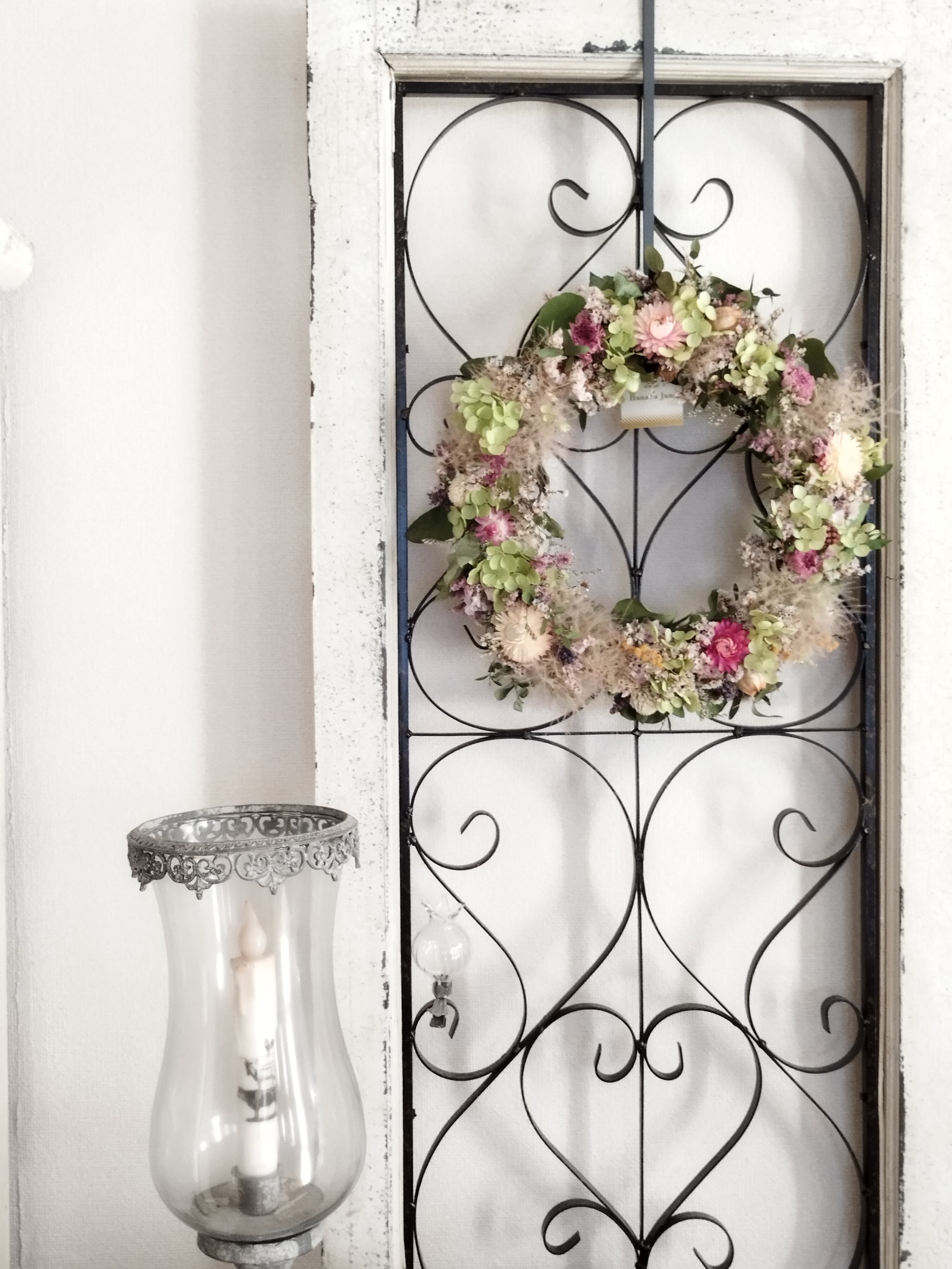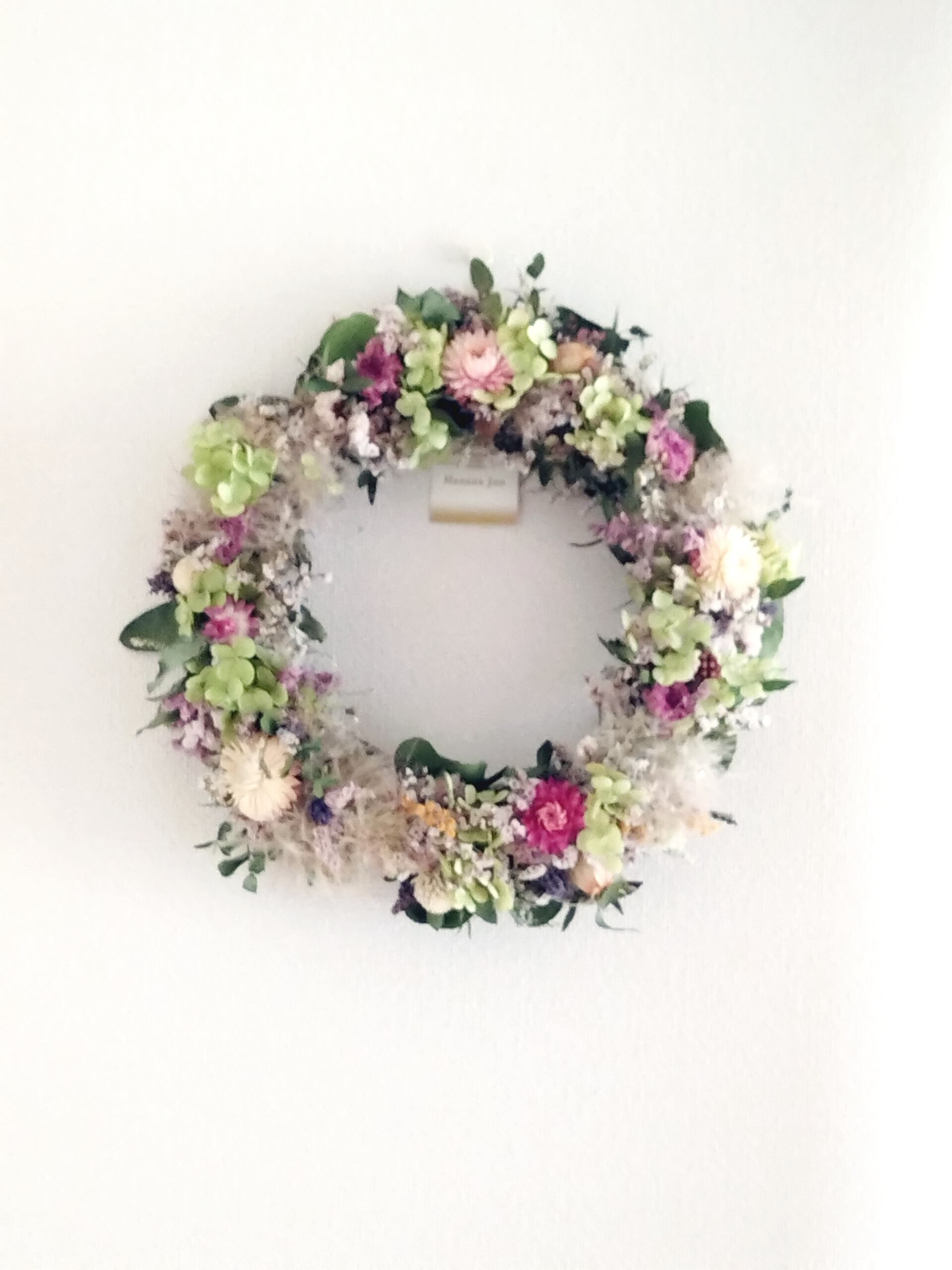 アナベルとスモークツリーをユーカリで支え、小花を散らした完全ドライフラワーリースです。