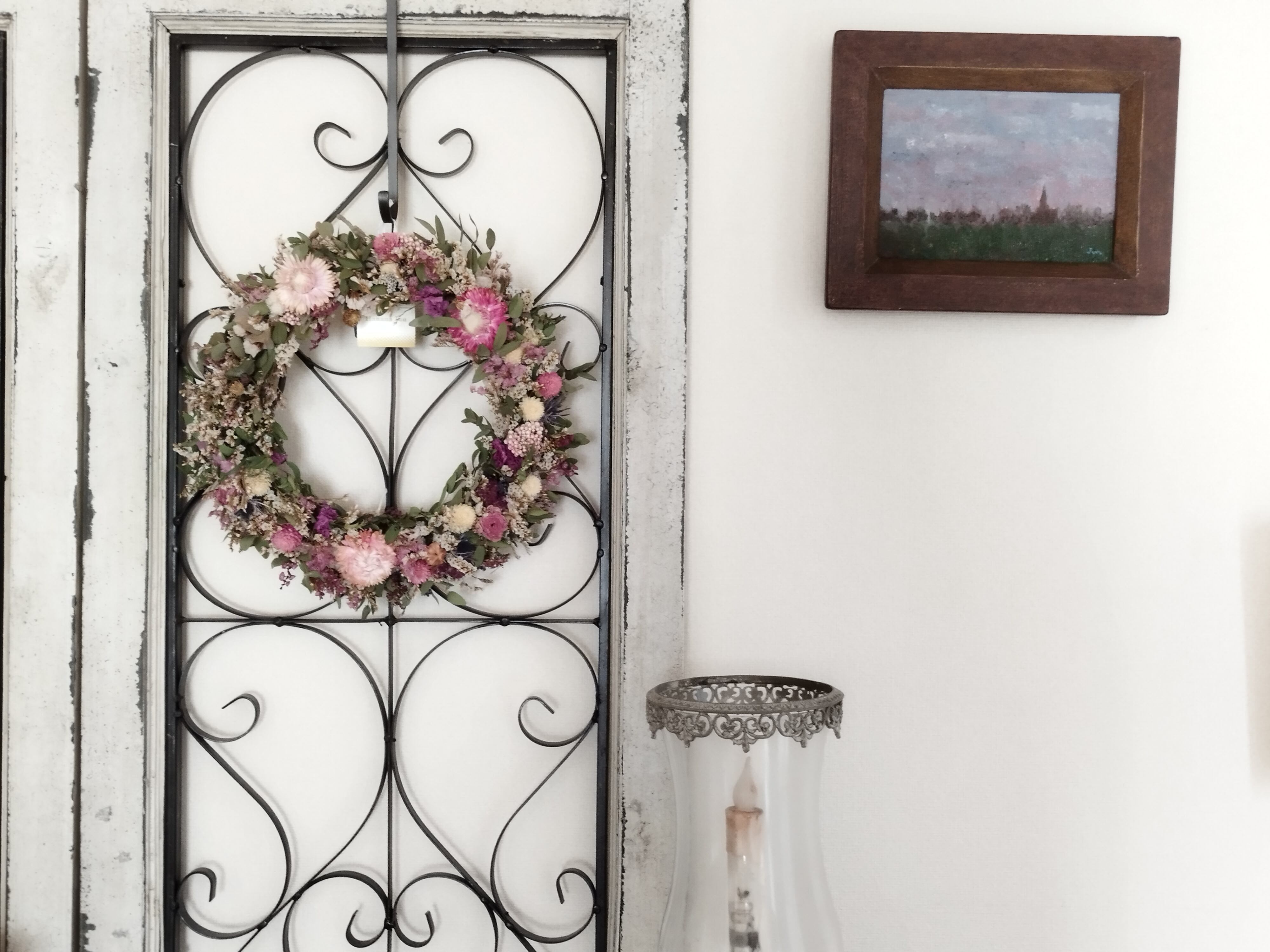 ユーカリと小花の完全なドライフラワーリースです。全て天然素材のため、徐々にアンティークな色合いに変わります。ごいっしょに時の流れを、お楽しみください。(実物は写真よりもくすんだ色合いです)