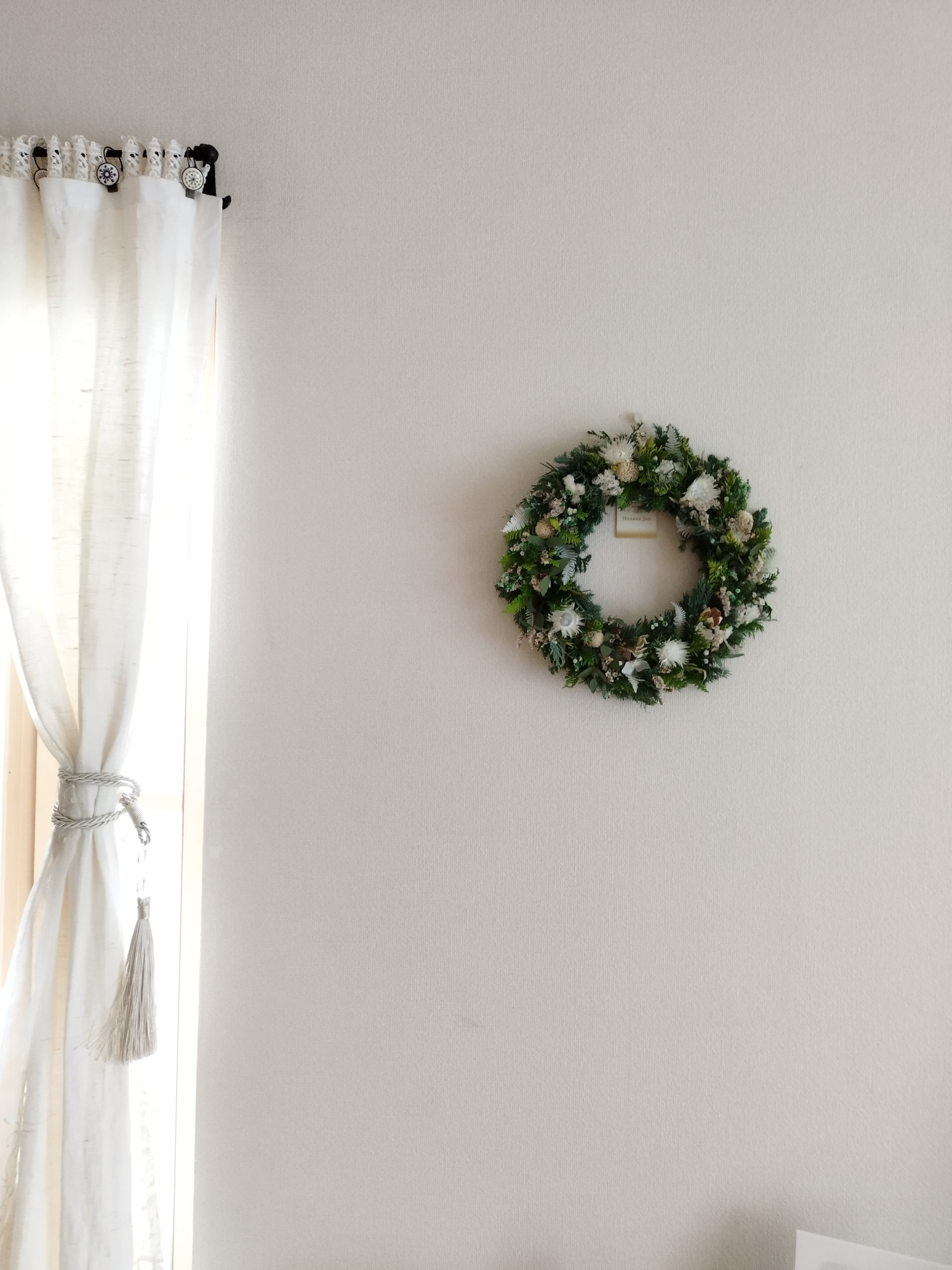 緑の中に白いお花が咲いているようなクリスマスリースが出来上がりました。とても自然な雰囲気ですから、クリスマス以降もお部屋に飾って頂けそうです。また、小ぶりですから、場所を選びません。