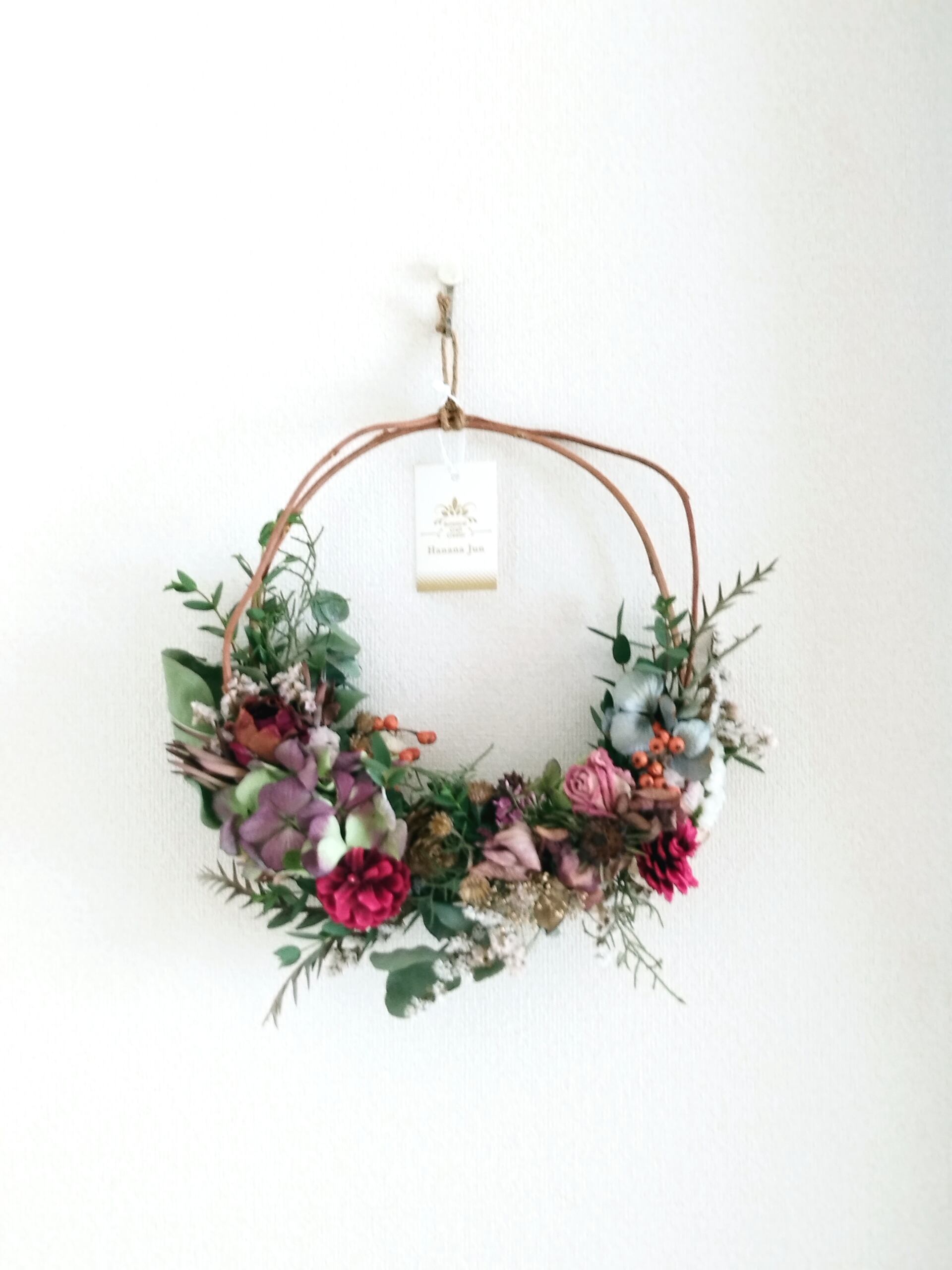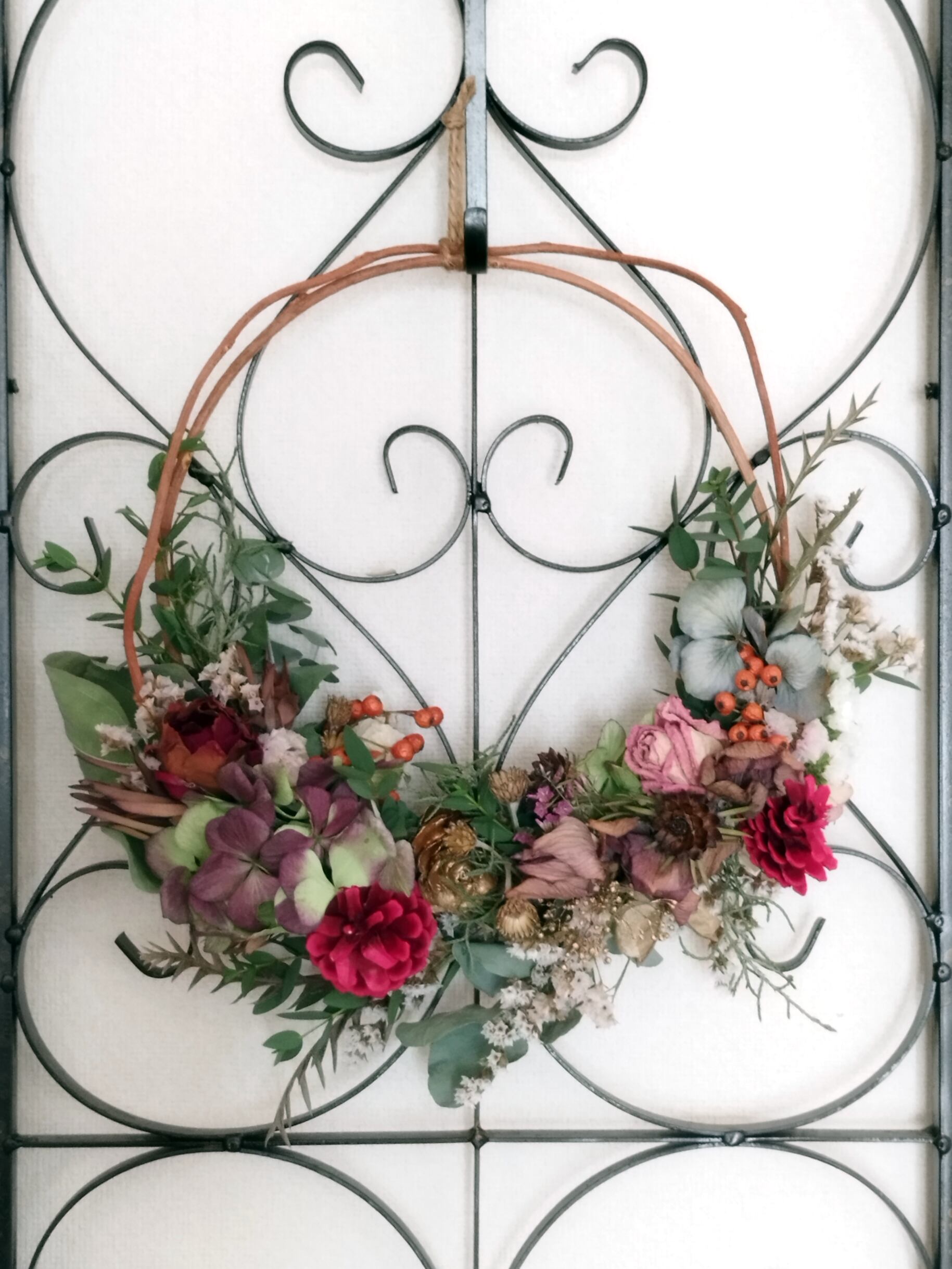 ユーカリ2種類、マツカサ、アジサイ、リューカデンドロン2種類、スターチス、バラの実、カスミ草(金染色)、クリスマスローズ、バラなど全て天然素材のドライフラワーを巻き上げました。